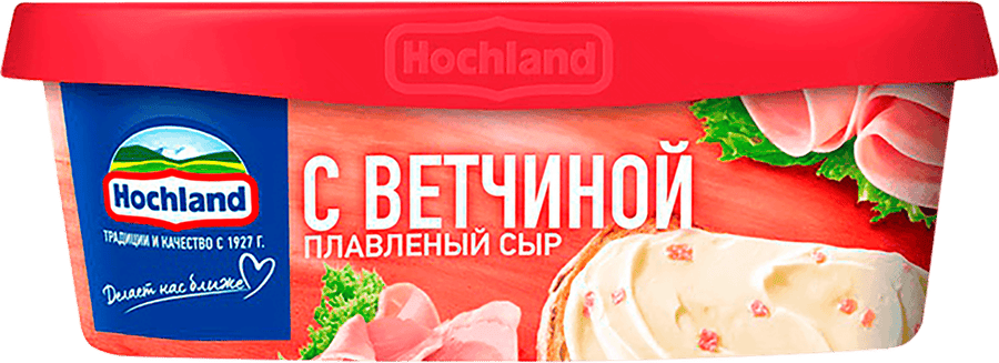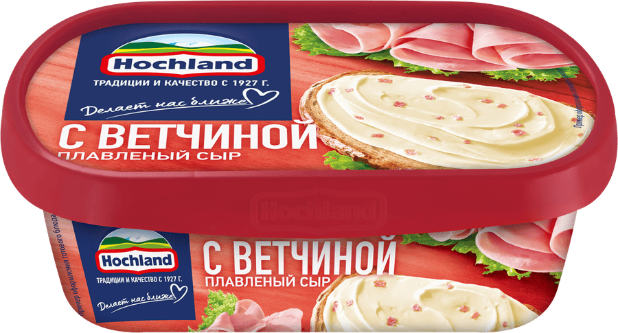 В плавленом сыре Hochland с ветчиной не просто много, а очень много кусочков настоящей ветчины. Высококачественная натуральная ветчина измельчается на кусочки прямо перед добавлением в плавленый сыр. Побалуйте себя ярким насыщенным вкусом любимого плавленого сыра Хохланд с ветчиной!