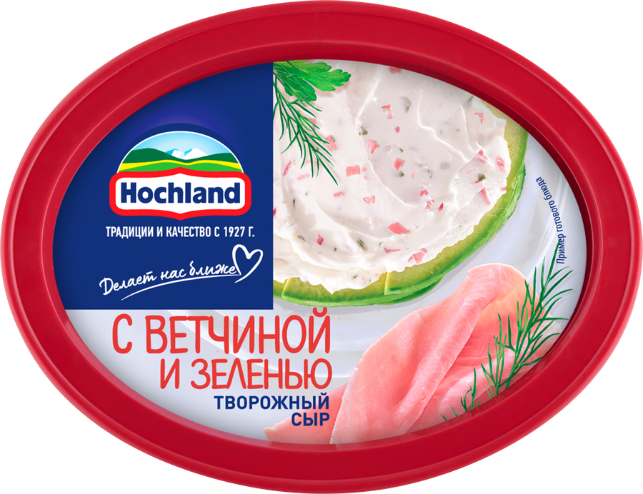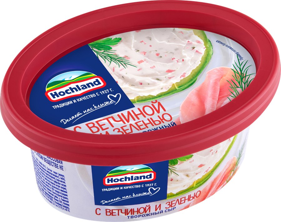 Творожный сыр Hochland с ветчиной и зеленью сделан из творога, приготовленного из натуральных сливок и молока. Это уникальное сочетание нежного вкуса свежего творожного сыра с добавлением натуральных кусочков сочной ветчины, зелени и специй. Сыр отлично намазывается, подходит для приготовления легких бутербродов и сэндвичей, закусочных рулетов, прекрасно сочетается со свежими и печеными овощами.