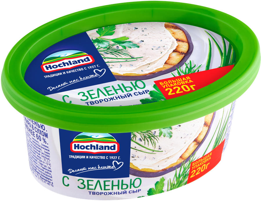 Сыр творожный Hochland с зеленью – нежный продукт, сочетающий в себе вкус сливочного творога и молодого сыра с пикантной ноткой свежей зелени. Готовится он из натурального молока и отлично подходит для всей семьи. Сыр обладает приятной консистенцией и легко намазывается на хлеб, горячие тосты и хрустящие крекеры. Он идеален для дополнения как классических бутербродов, так и более интересных блюд - блинчиков, равиоли, творожно-сырной лепешки.