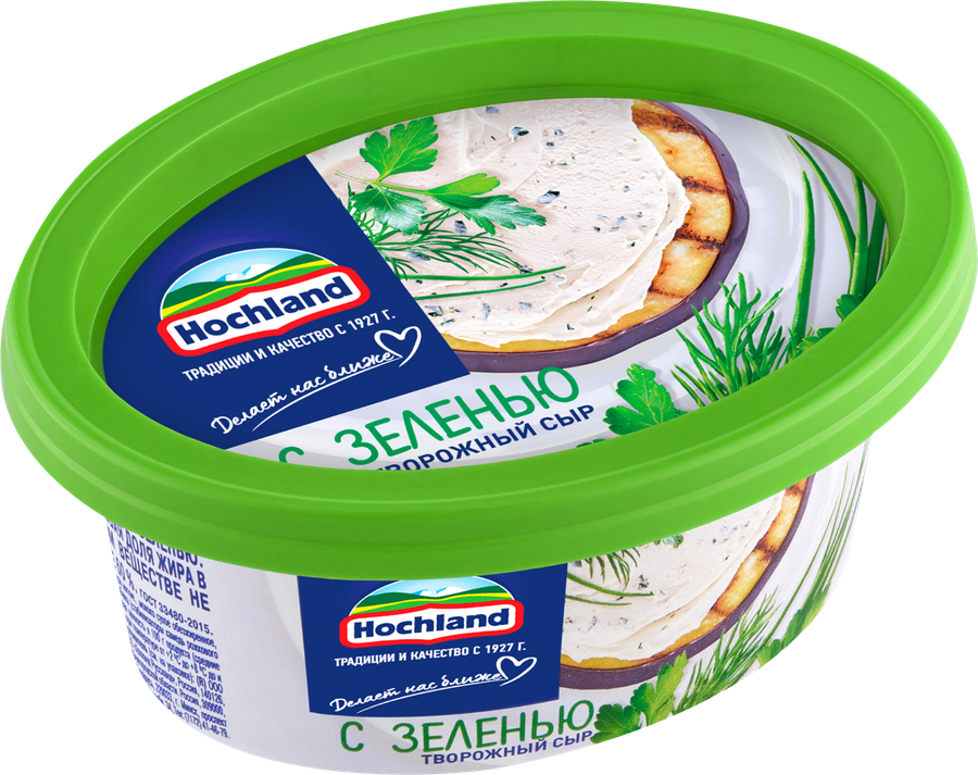 Творожный сыр Hochland с зеленью – идеальное нежное сочетание сливочного вкуса со свежестью душистой зелени. Сделан из творога, приготовленного из натуральных сливок и молока. Сыр обладает приятной консистенцией и легко намазывается на хлеб, горячие тосты и хрустящие крекеры. Он идеален для дополнения как классических бутербродов, так и более интересных блюд - блинчиков, равиоли, творожно-сырной лепешки.