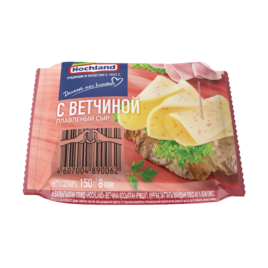 Плавленый сыр Hochland с ветчиной – один из самых популярных вкусов! Ломтики Hochland содержат большое количество сочных кусочков настоящей ветчины, а форма ломтика идеально подойдет для самого сложного бутерброда. Благодаря удобному формату упаковки любимым вкусом плавленого сыра можно насладиться в любой ситуации – будь то на работе, в дороге или на пикнике.
