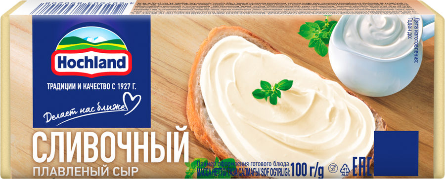 Плавленый сыр Hochland Сливочный в фольге – классический формат упаковки, который знаком всем с детства. Блочок плавленого сыра Hochland отличается своей универсальностью – его одинаково удобно использовать как в качестве снека или для бутерброда, так и для кулинарии. Нежный сливочный вкус плавленого сыра Hochland станет прекрасным дополнением к любому блюду.