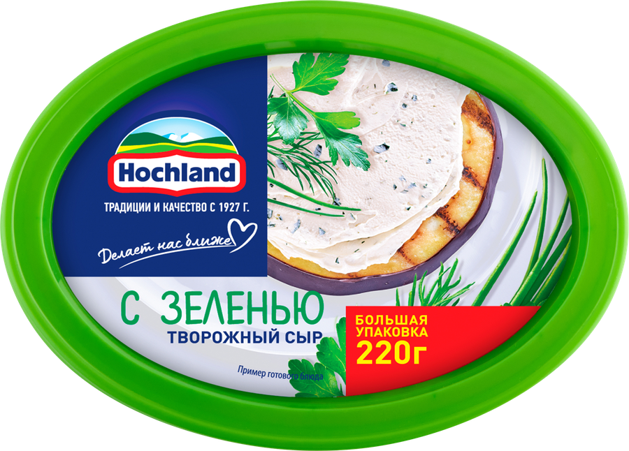 Сыр творожный Hochland с зеленью – нежный продукт, сочетающий в себе вкус сливочного творога и молодого сыра с пикантной ноткой свежей зелени. Готовится он из натурального молока и отлично подходит для всей семьи. Сыр обладает приятной консистенцией и легко намазывается на хлеб, горячие тосты и хрустящие крекеры. Он идеален для дополнения как классических бутербродов, так и более интересных блюд - блинчиков, равиоли, творожно-сырной лепешки.